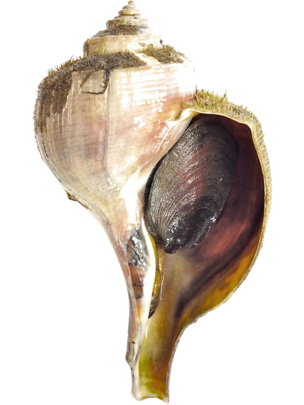 Conchs are large, heavy, carnivorous snails that inhabit shallow environments nearshore below the tideline and are found locally from May through November. Their shells have large body whorls and siphonal canals that draw in water to breathe. Knobbed whelks have low knobs or spines around their whorls; channeled whelks have a groove, or channel. Both shells open on the right. Their bodies are divided into head, abdomen, and foot, with two tentacles on the head to sense prey, and black eye spots at the base of the tentacles. A hard plate called an operculum acts as a trap door when the snails retract. Female whelks mature between 9 to 10 years of age at a shell width of 3 to 4 inches. Male whelks reach maturity at 7 years at a width slightly less than 3 inches. They eat clams, oysters, mussels, and other bivalves. They are also scavengers. To feed, they use their foot to hold prey while the lip of their shell wedges and pries open the bivalve. They are caught by trap gear (“conch pots”).